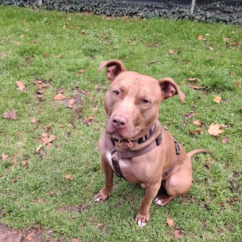 Der 4 jährige Pitbull Rüde zeigt sich im Erstkontakt aufgeschlossen gegenüber Menschen, ist aber sehr stumpf, distanzlos und testet schnell aus, wie ernst er sein Gegenüber nehmen kann.