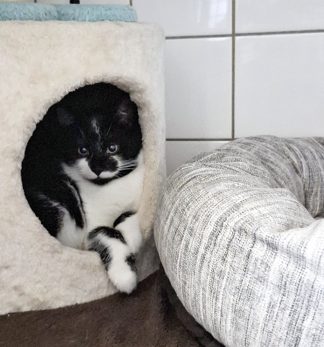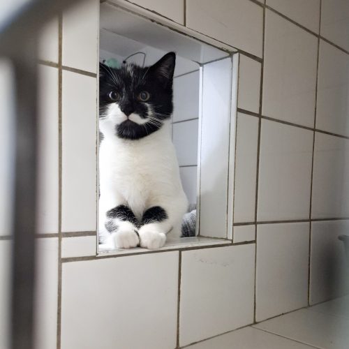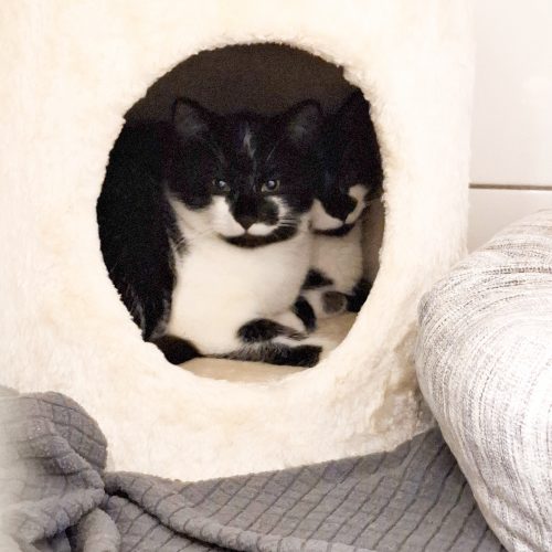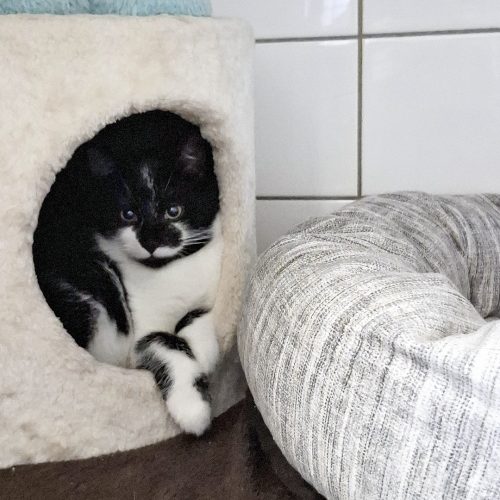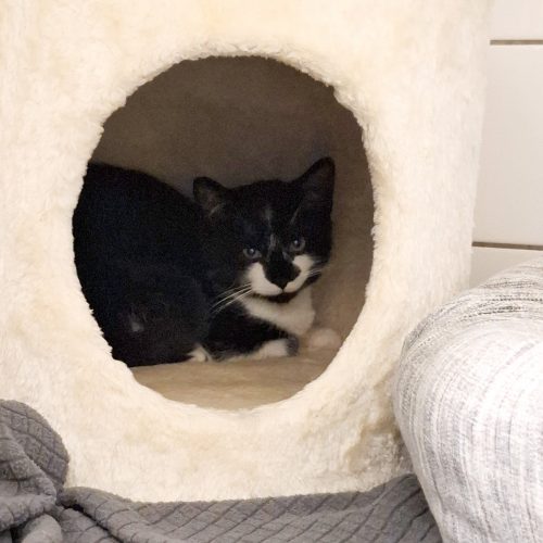 Sie konnten, nach einem Ausbruch aus der Sicherung des Finders, mit einer nervenaufreibenden Rettungsaktion (auch mit Einsatz der Feuerwehr) über mehrere Tage, wieder eingefangen werden, und dürfen nun eng aneinander gekuschelt in ihrer kleinen Kuschelhöhle erst einmal bei uns zur Ruhe kommen.